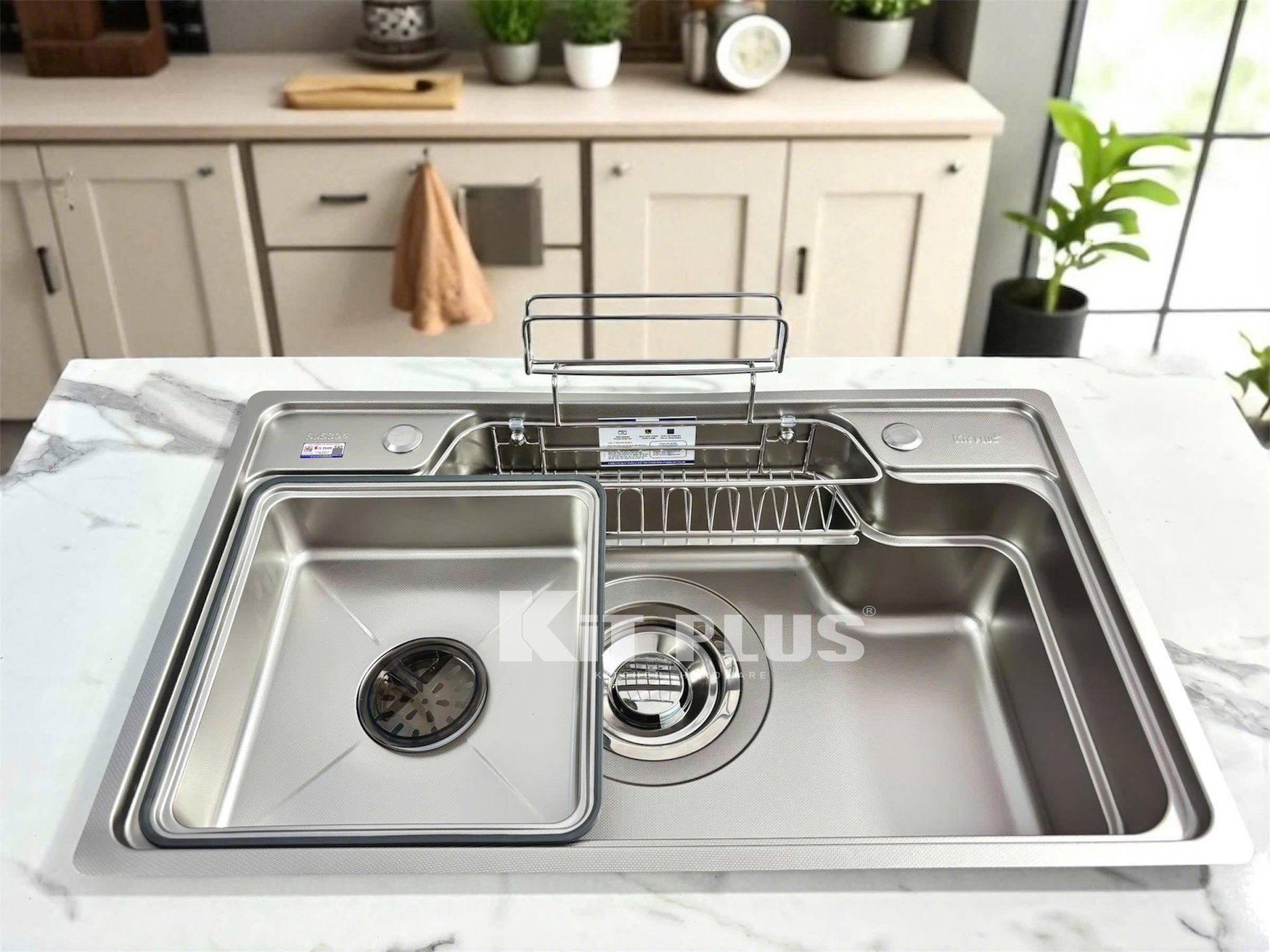 - Thiết kế hiện đại với gờ hạ bậc – tích hợp phụ kiện thông minh: Thớt inox – nhựa, rổ úp bát, siphon Z slim,…