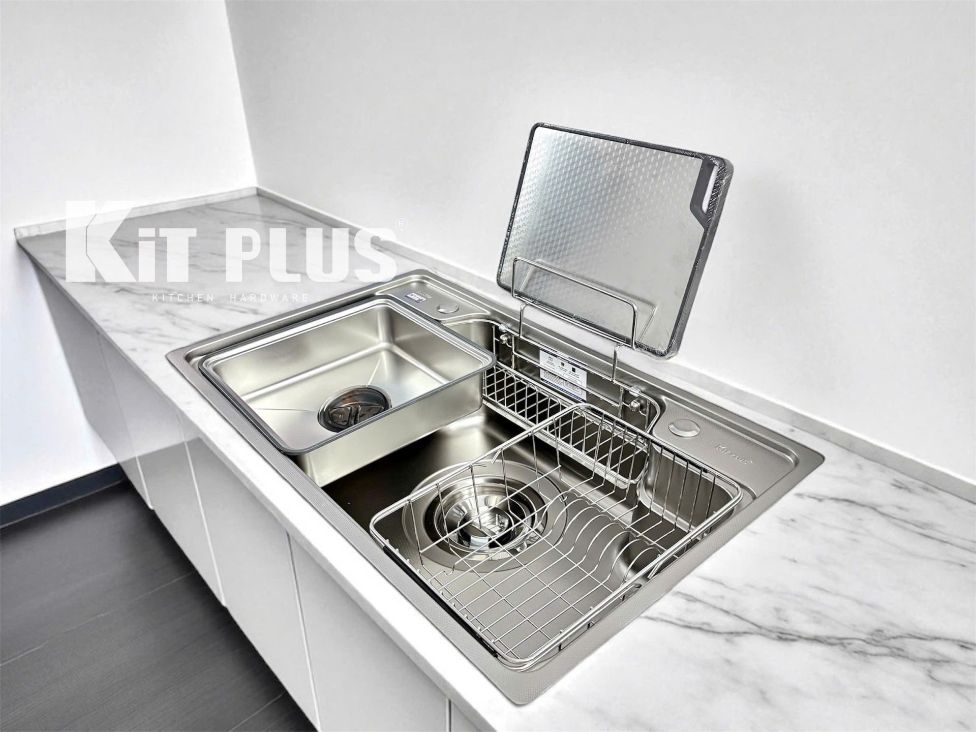 - Thiết kế hiện đại với gờ hạ bậc – tích hợp phụ kiện thông minh: Thớt inox – nhựa, rổ úp bát, siphon Z slim,…