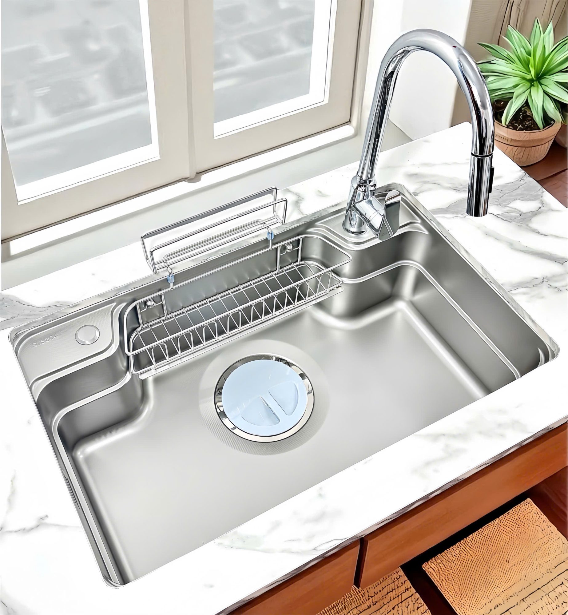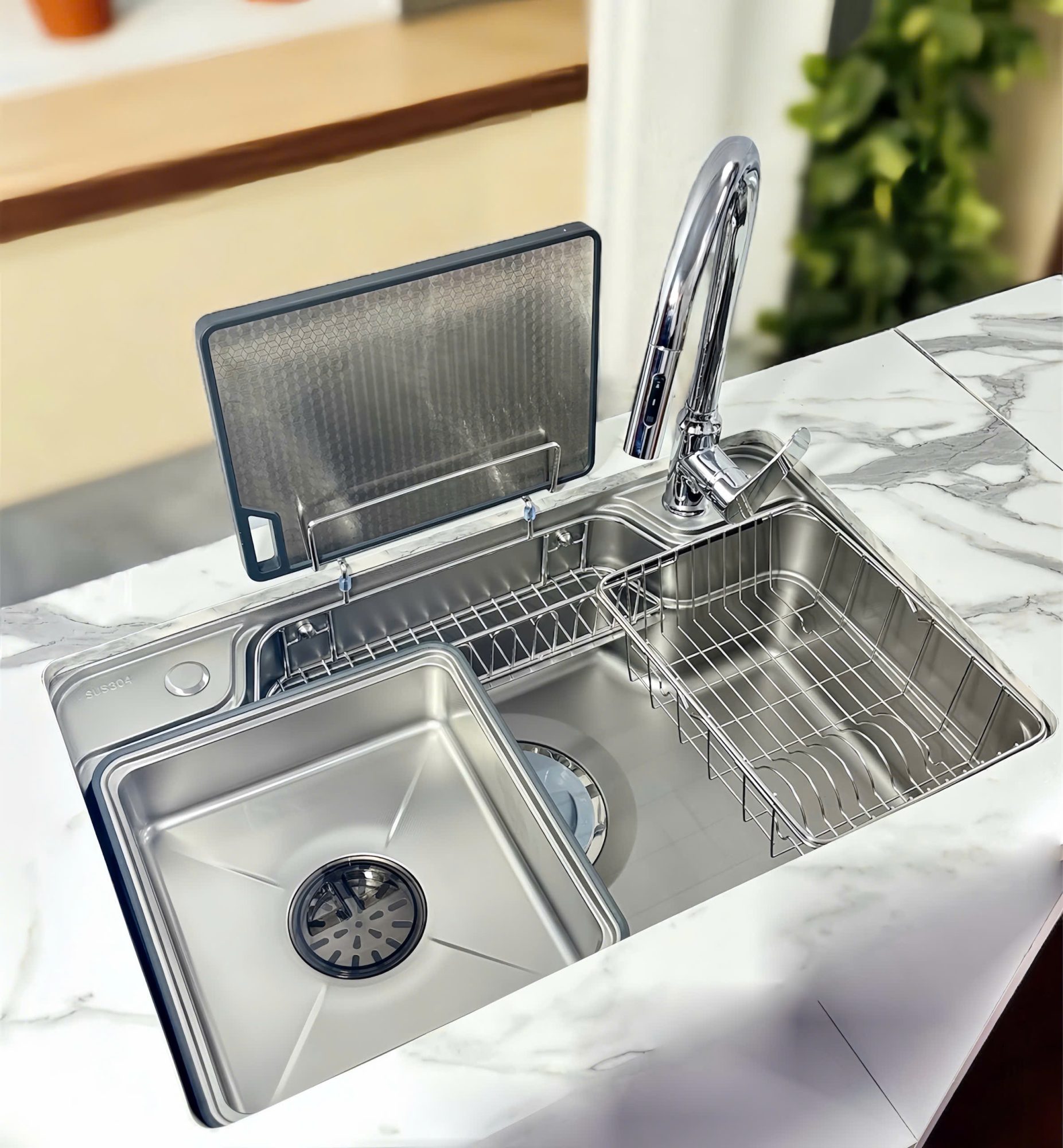 - Thiết kế hiện đại với gờ hạ bậc – tích hợp phụ kiện thông minh: Thớt inox – nhựa, rổ úp bát, siphon Z slim,…