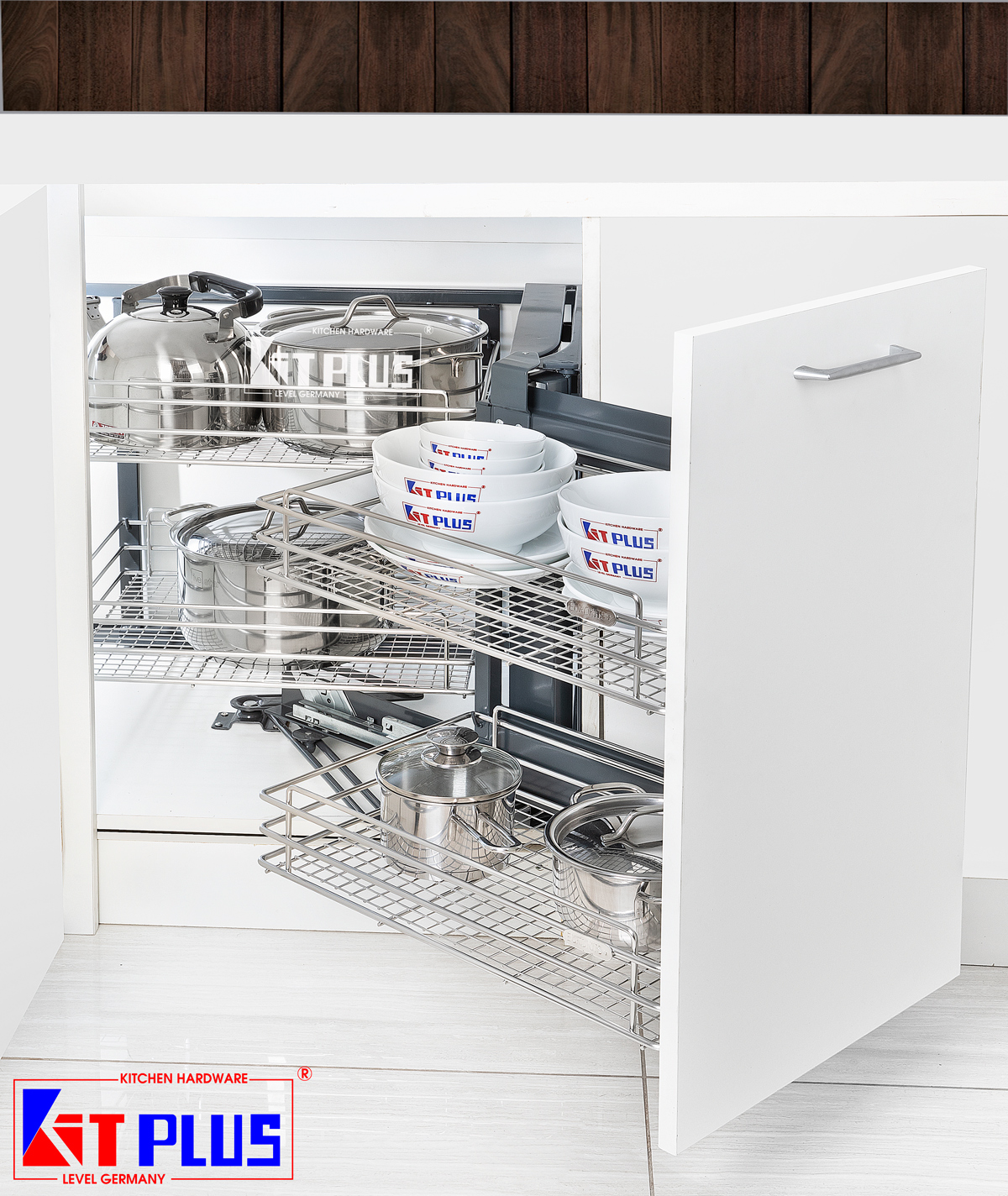 Giải phóng góc khuất tủ bếp với kệ góc liên hoàn Inox 304 KitPlus. Khung sơn tĩnh điện chịu lực, thiết kế 4 giỏ nan vuông trượt êm ái. Khám phá ngay!