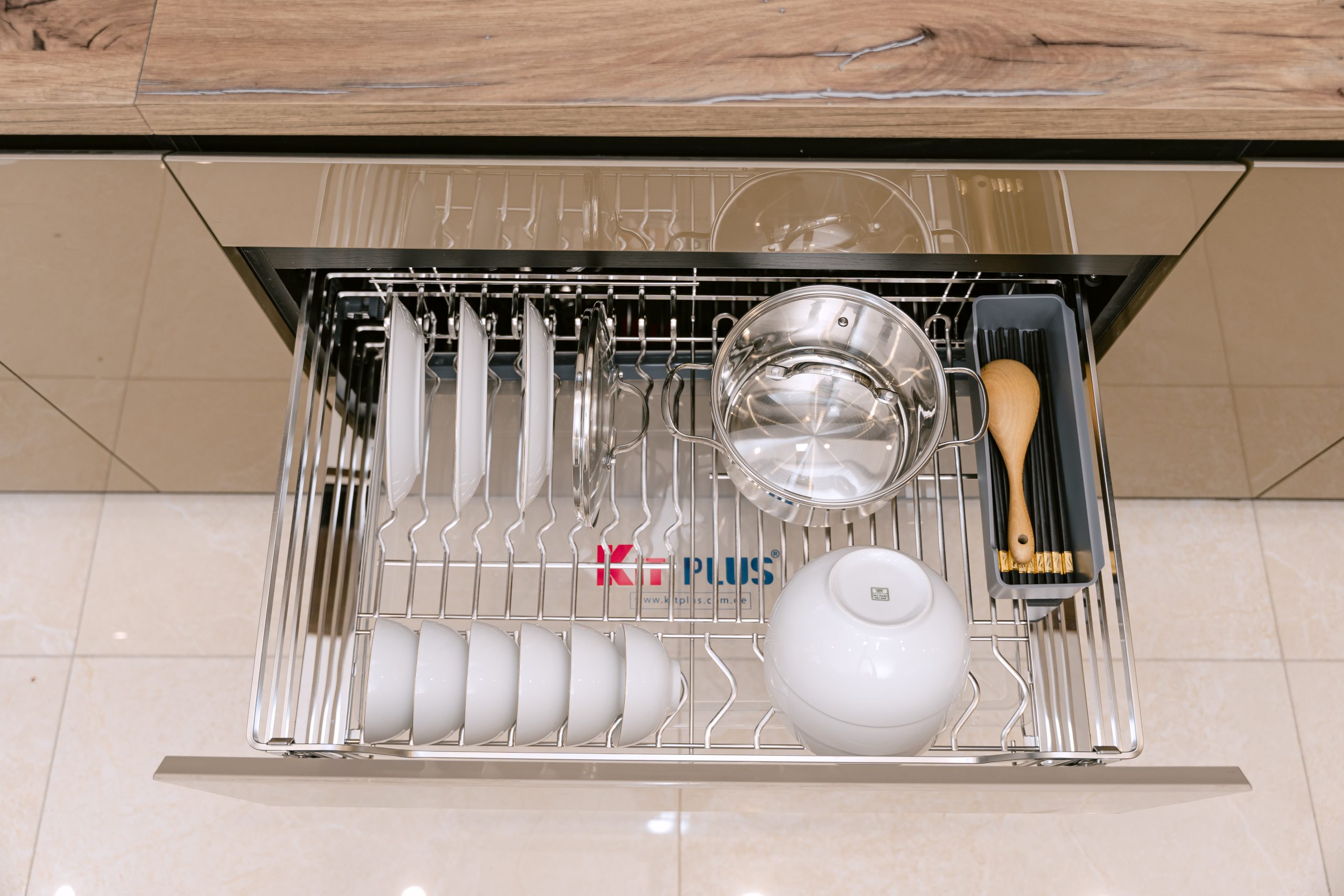 Sản phẩm là sự tích hợp thông minh giữa kệ xoong nồi và giá bát đĩa, giúp quy hoạch toàn bộ vật dụng cồng kềnh vào một ngăn kéo duy nhất. Thiết kế này không chỉ giải phóng diện tích mặt bếp mà còn giúp việc sắp xếp đồ dùng trở nên khoa học, dễ dàng lấy cất chỉ với một thao tác kéo nhẹ.