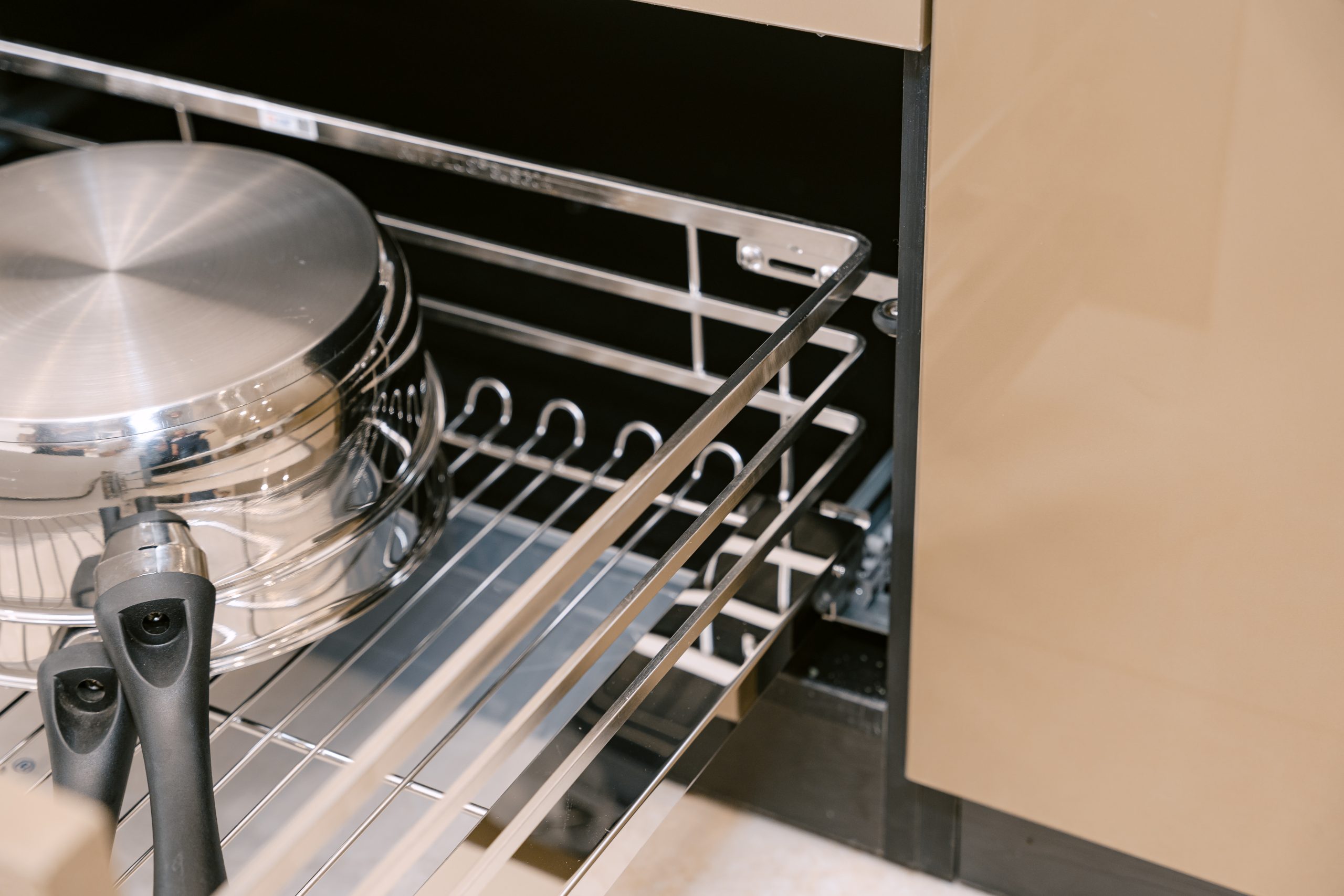 Điểm đắt giá tạo nên sự khác biệt của phiên bản DG chính là thiết kế giỏ Inox với chiều sâu cực lớn. Cấu trúc này tận dụng triệt để những khoảng lùi sâu nhất của khoang tủ bếp dưới – nơi thường bị lãng phí do khó với tới. Giờ đây, từ những bộ nồi luộc gà cỡ đại, chảo xào sâu lòng cho đến các rổ rá cồng kềnh đều được xếp gọn gàng vào chung một ngăn kéo, trả lại bề mặt bếp sự thông thoáng, tinh tươm.