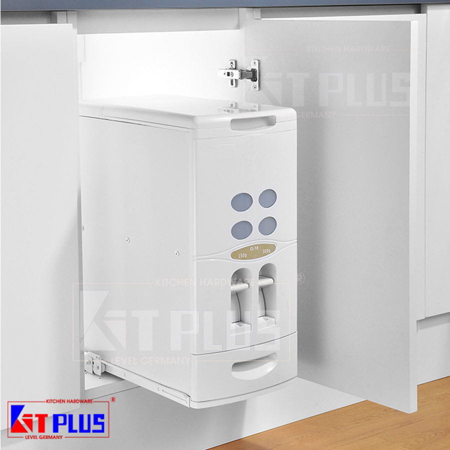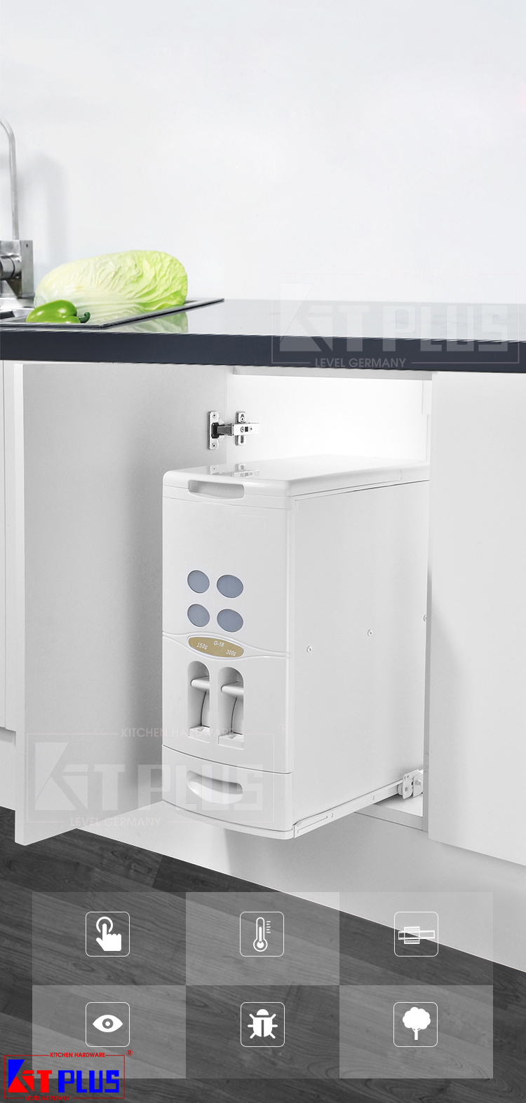 - Sản phẩm thùng gạo âm tủ 2 nút ấn thông minh DB18 được sử dụng cho tủ dưới và lắp âm tủ,