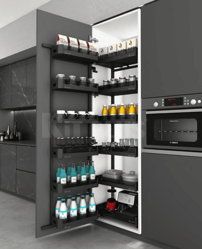 Tủ kho được thiết kế thu gọn tron g khoang tủ tiết kiệm không gian cho căn bếp.